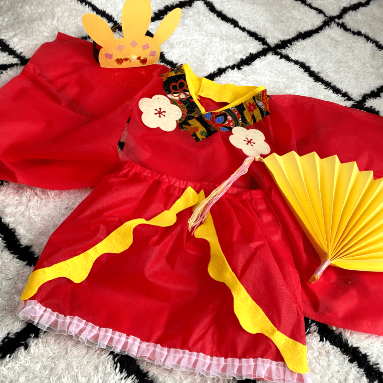 お友達のママがひな祭りパーティを開いてくれることになって、何か盛り上がることがしたいなと思い、100均の不織布を使って即席の“お雛様コスチューム”を作ってみたんです。