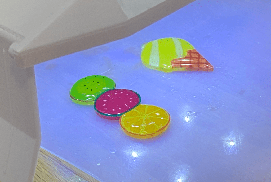 色鉛筆で塗った面にレジン液をたらして、UVライトで硬化させます。