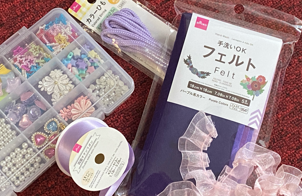 私は推しの概念を強めるため、この作品では布を使っているんですが、100均のラッピングコーナーに置いてあるサテンリボンなどで大丈夫です!
