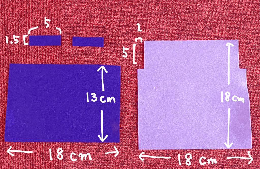 数字は全てセンチです。今回は左の濃い紫が表面、右の薄い紫が背面とフタ部分になります。