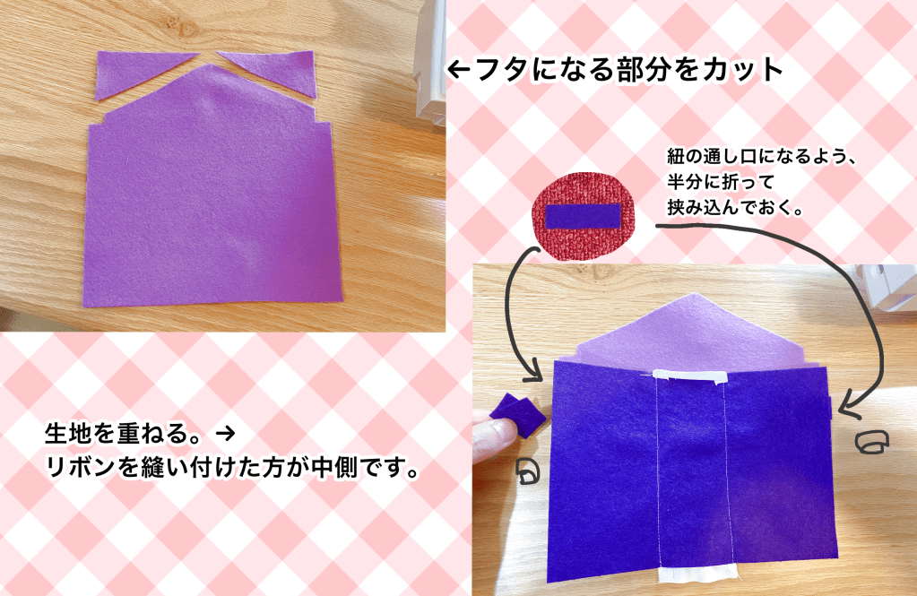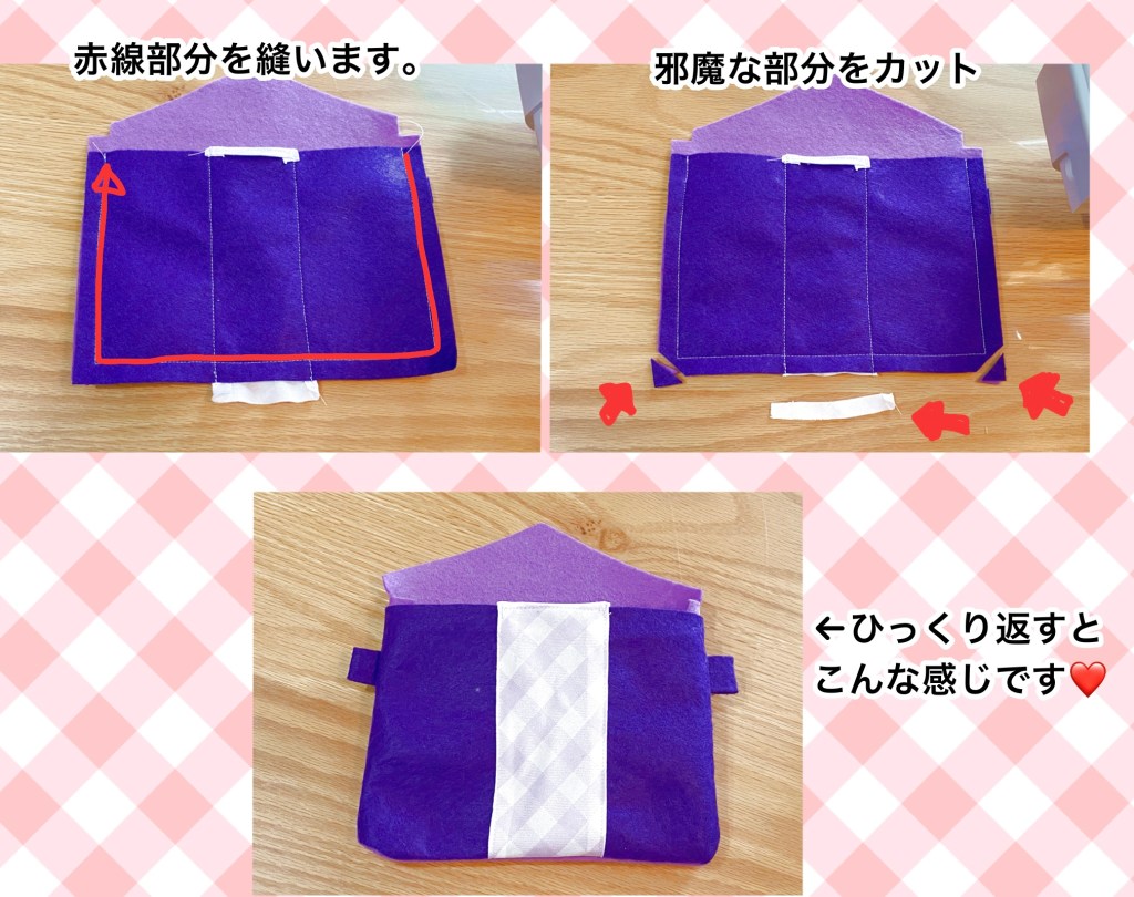 縫い代1センチほどで重なっている部分をぐるっと縫います。角やリボンのはみだしを少しカットしてひっくり返します。