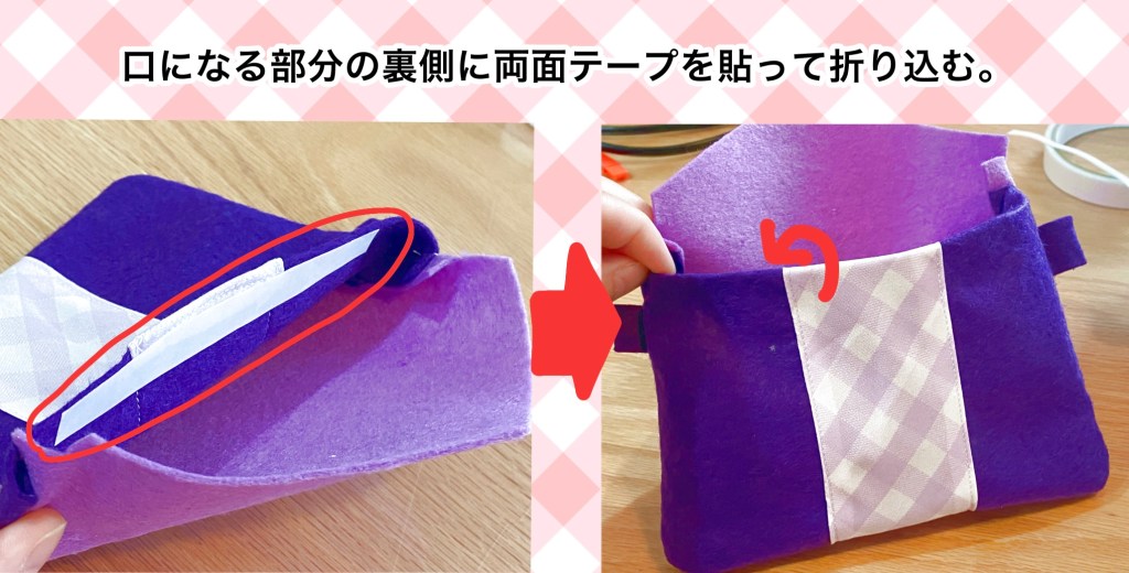 ポーチの口にあたる部分、このままでもいいのですが、切りっぱなしのフェルトがちょっと心許ないので、裏側に両面テープを貼り、その部分を後ろに折り込み貼り付けます。