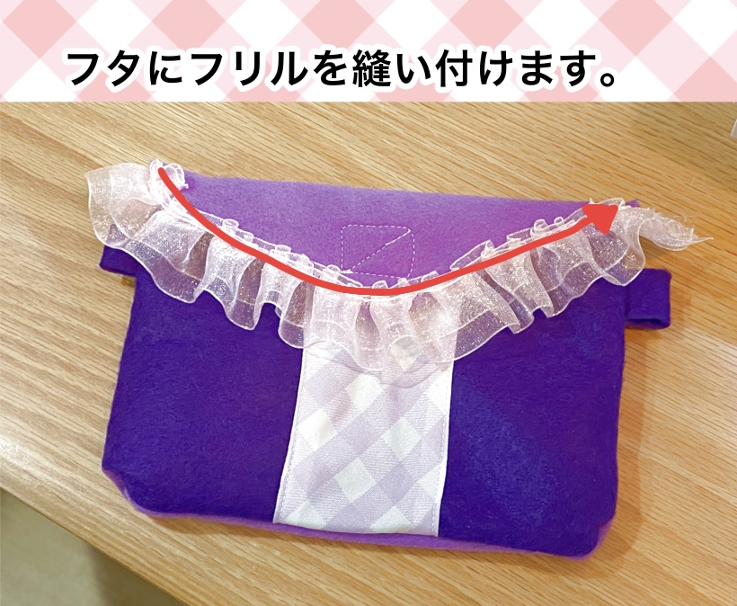 フリルのバランスやフタの端の生地の余りが気になる場合は縫い糸を切らないように、ハサミで切って調整しましょう。フェルトなら加工がしやすいのも初心者向けには嬉しいです。