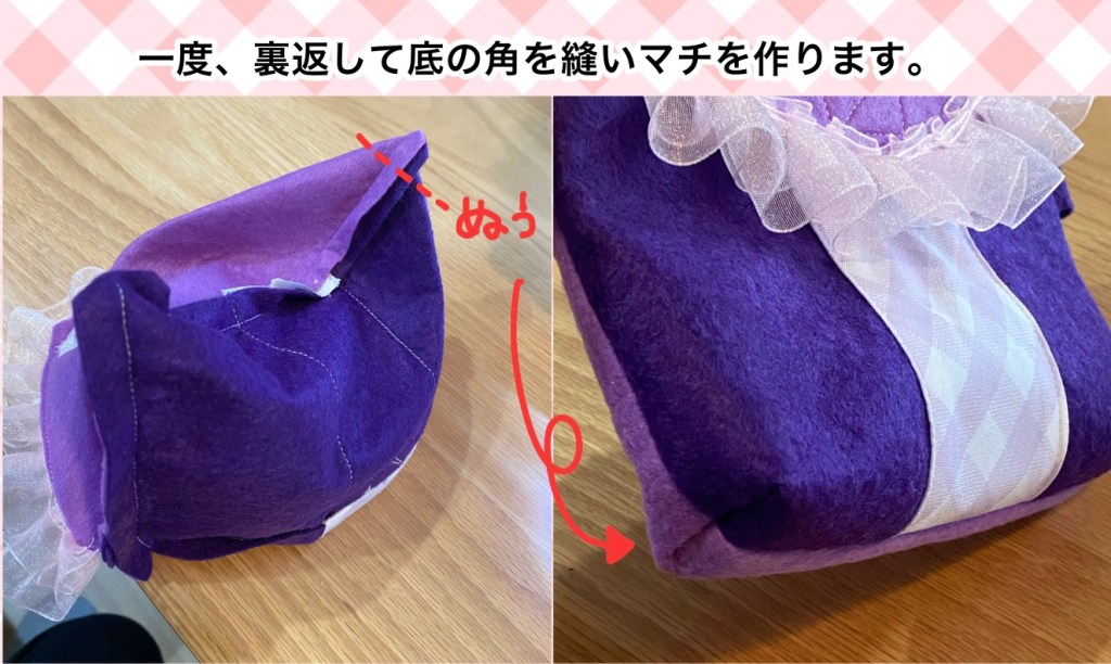 一度生地を裏返して、底の角にあたる部分を縫い目を重ねて三角に潰すような形にして縫うと、表に戻した時にマチができます。