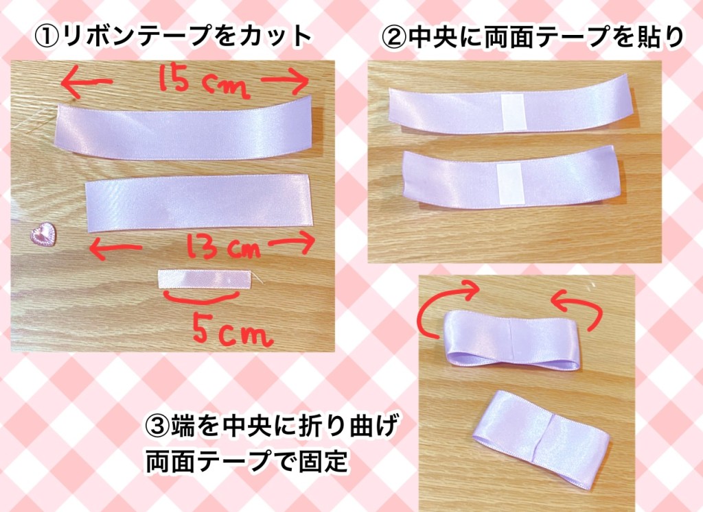 15センチと13センチにそれぞれカットして、中央に両面テープを貼ります。リボン生地に表裏がありそうな場合は裏面に両面テープを貼ってください。