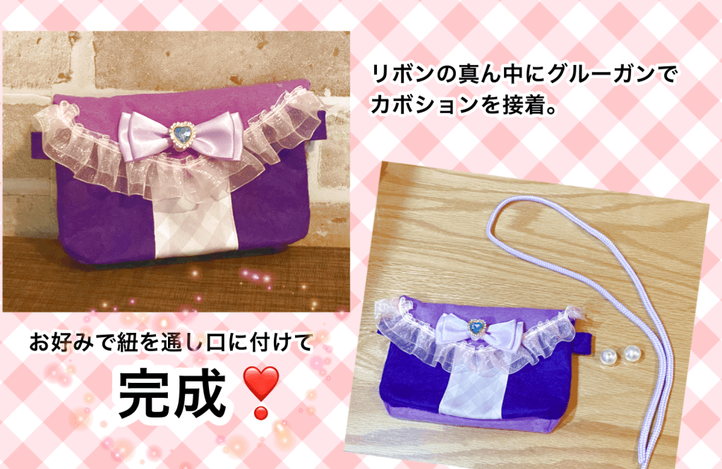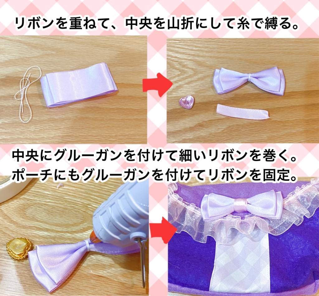 中央の縛った部分にグルーガンを少しつけて、細い幅のリボンを巻き付けます。続けてその流れで、ポーチにもグルーガンを付けてリボンを固定します。