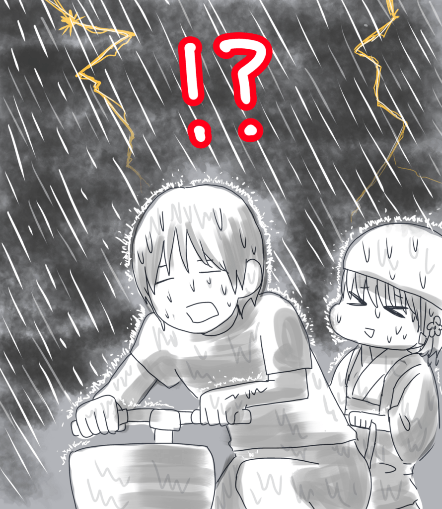 自転車で急いで帰ったものの、家族そろってびしょ濡れに(笑)。