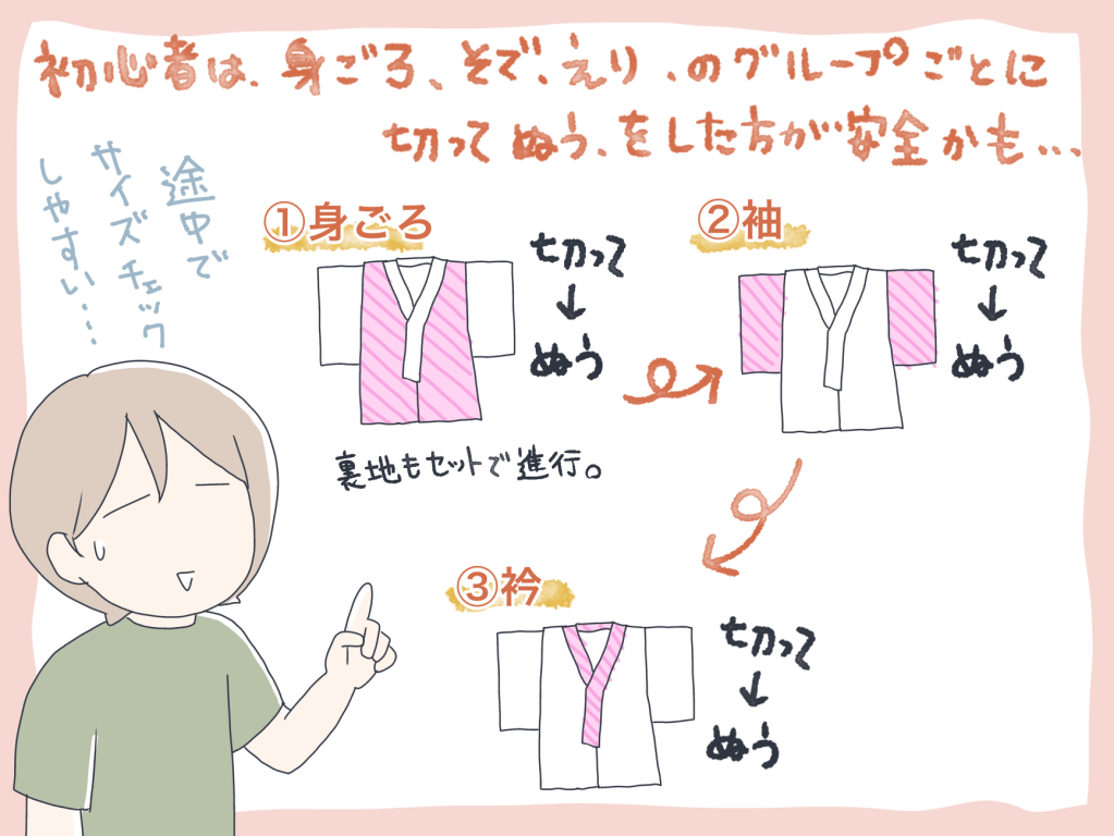 衿は小さいパーツだからまだ良かったのですが、パーツによっては残り布ではサイズを取れないこともあるので危なかったです…。