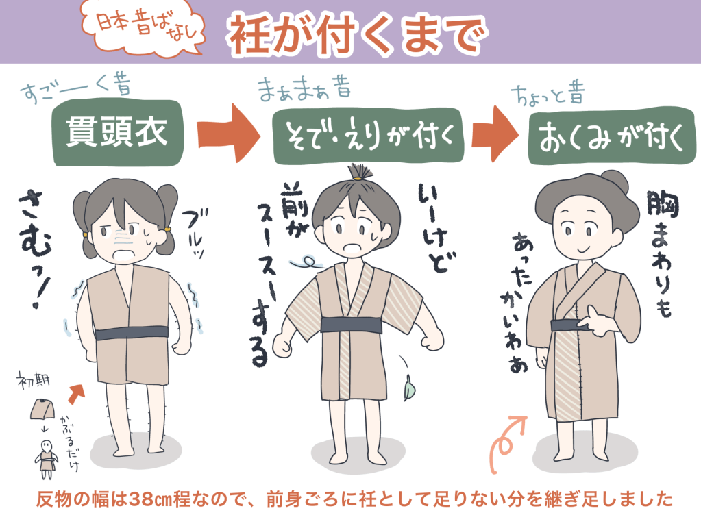 日本の衣服は最初は「貫頭衣(かんとうい)」という、長方形の布の真ん中に首を出すようの穴を付けて被るスタイルのものでした。