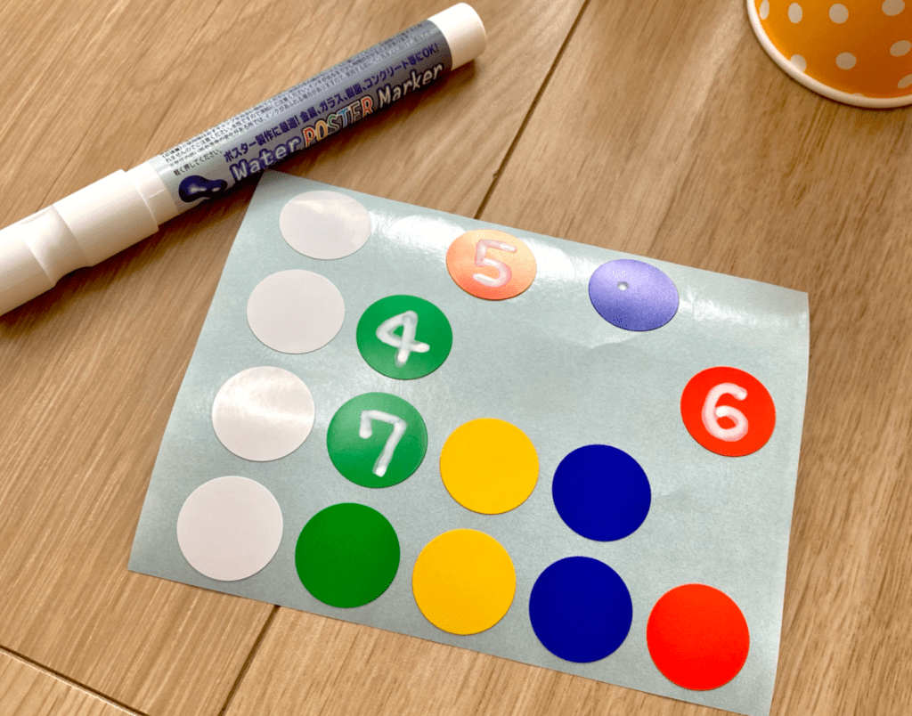 白ペンを使うと、濃い色のシールにもくっきり数字が書けるのでおすすめです。