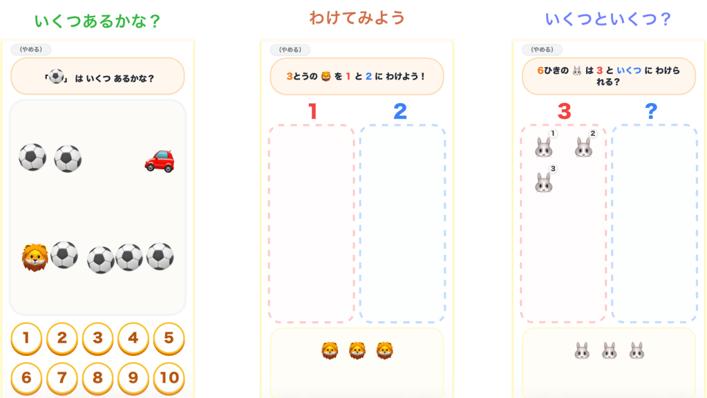 いくつあるかを数える遊び、数を分ける遊び、いくつといくつに分かれるかを考える遊び、の3つのモードがあります。