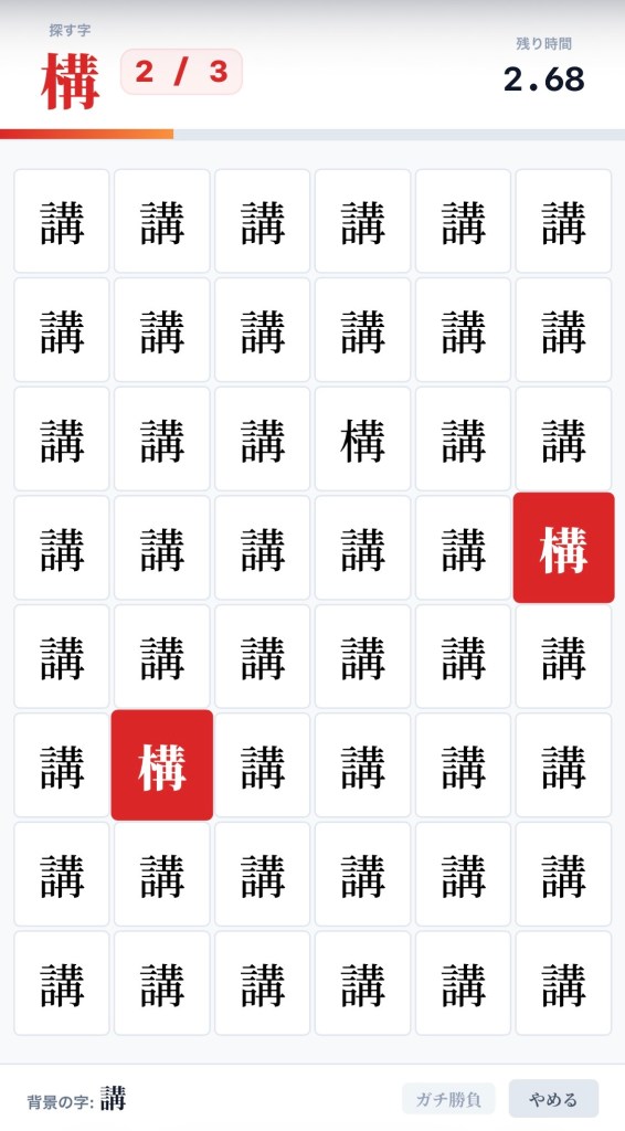 同じ漢字の中に混ざった、3つの違う漢字を見つけるだけ!